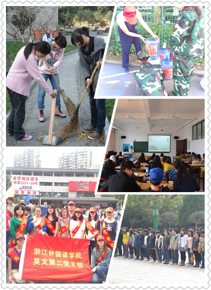 “我们在回家的路上——情系南站”、“相约春天,爱心在行动”、“学习雷锋好榜样,传递英文正能量”、“缅怀革命烈士,清明节扫墓”、“红五月,我们在行动”、“树立榜样,成长接力”等等,都是党支部组织下开展的系列实践活动,这些有意义的活动既锻炼了学生党员的党性,又发扬了学生党员服务社会,关爱身边学子的奉献精神。