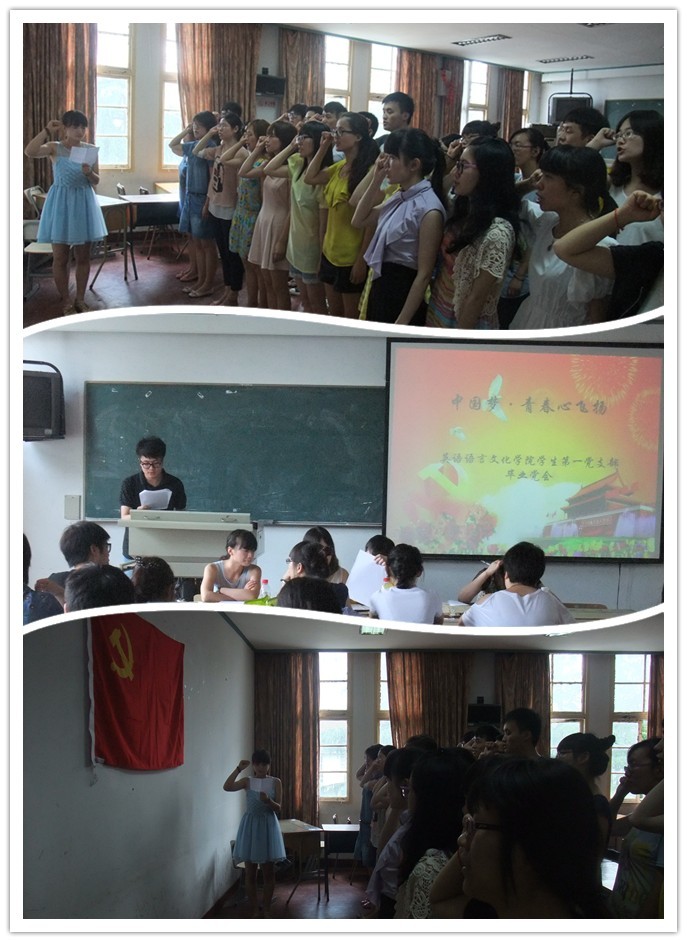 近日,英语语言文化学院学生第一党支部举行“中国梦•青春心飞扬”毕业生党员教育活动。活动中,全体毕业生党员重温了光荣而神圣的入党誓言,鼓励毕业生时刻牢记党员宗旨,在新征途中展现党员风采。