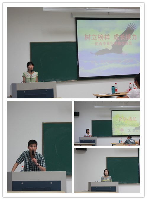 近日,英语语言文化学院举办了“树立榜样 成长接力”优秀毕业生经验分享会。成功考取教师、公务员、研究生以及国外申请成功的09级优秀毕业生以座谈、经验介绍等多种形式就他们大学时代的心路历程、考研心得、求职感受、学习方法等内容对低年级同学开展典型教育,使毕业班同学的宝贵经验成为低年级同学的宝贵财富。