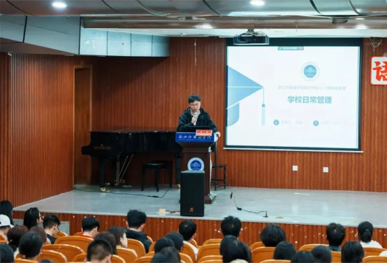 10月16日晚,永利娱城app新生始业教育第二讲在博文堂举行,教学副院长陶伟、辅导员吴小慧、张俊分模块向同学们进行介绍。