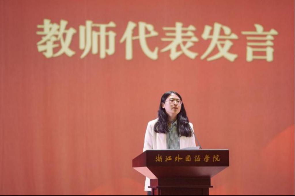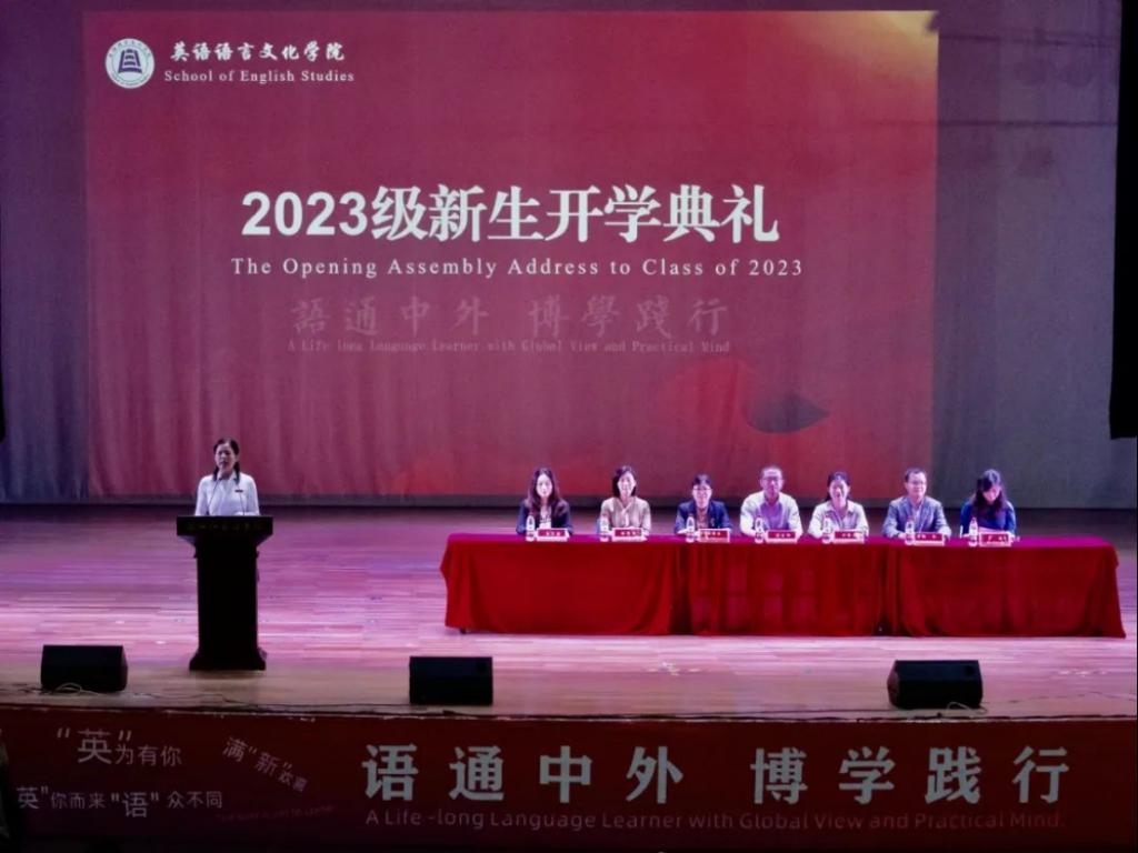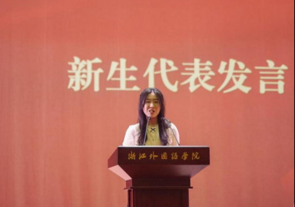 新生代表2023级英语(师范)1班的邵广妍对学院和师长们在迎新工作期间辛苦付出表示衷心感谢。她代表全体新生道出对未来的期许与展望:知行合一,履践致远,全面发展为具有家国情怀、国际视野的高素质应用型人才。