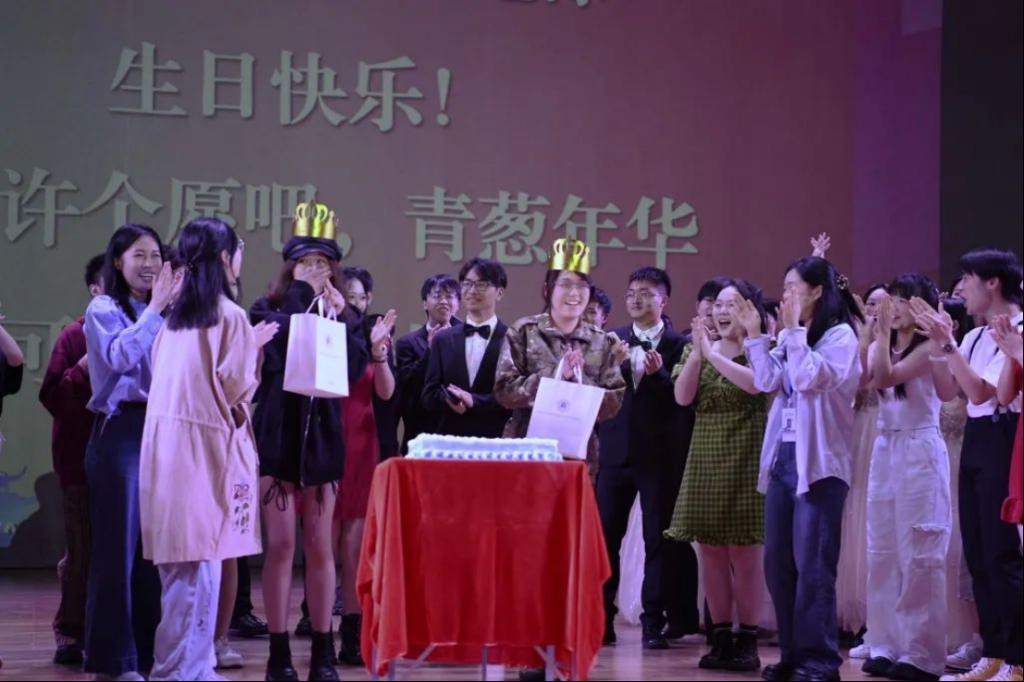 在最后的抽奖环节,一位位“幸运儿”走上台前领取自己的奖品,两位一等奖获得者是学院“精准”随机抽取的寿星。全院上下精心为她们筹备了大学的第一个生日的惊喜,蛋糕、歌声、祝福瞬间从天而降,现场气氛达到顶峰。全场师生同台共贺,共享喜悦。全体萌新一起许下愿望:与时代共进,续人生华章。