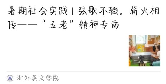 近日,由永利娱城app21口译班李俊林、林茈晗,22口译班余慧茹,22法语2班郭静婷等同学组成的知行合一“五老”访谈实践团队的作品《三尺讲台筑银魂 蜡炬始燃照边疆》入选浙江省教育系统“读懂中国”优秀微视频。
