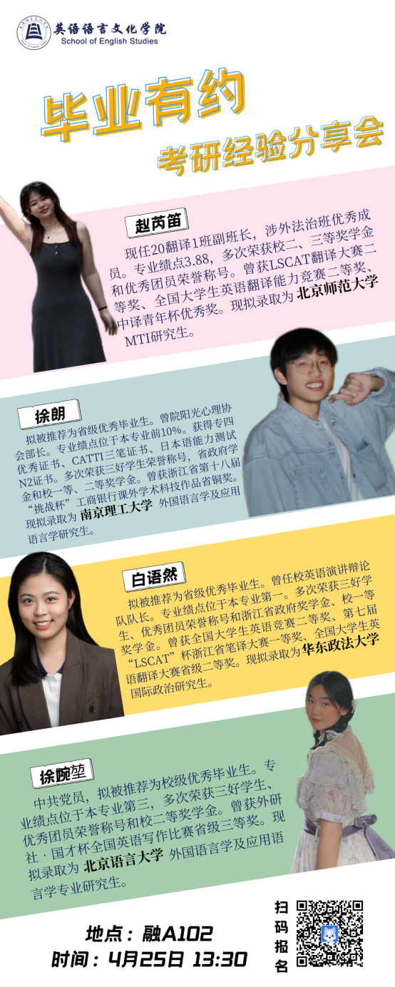 为帮助学院学子更全面地了解考研信息,建立清晰的备考目标,做好科学的备考规划,永利娱城app开展“毕业有约”第三期——考研经验分享会,邀请到了四位成功上岸的学长学姐们,向同学们系统地分享他们的“上岸心得”。