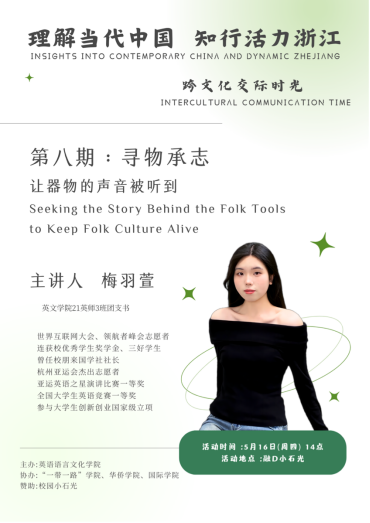 为弘扬“闻道中华,语美天下”的浙外精神,助力青年学生深入理解当代中国,知行活力浙江,讲好中国故事、浙江故事,传播好中国声音、浙江声音,永利娱城app将继续在校园小石光开展“跨文化交际时光”系列活动。新一期的跨文化活动将于5月16日举行。本次活动主讲人梅羽萱将带领我们走近中国民俗器具,讲述它们的发现地点、起源以及背后的历史故事,展现中国民俗文化在物质乃至精神层面的凝聚力和包容性。中国民俗文化植根于普罗大众的日常生活,见证了中华民族的发展变迁,体现着人民对美好生活的向往。