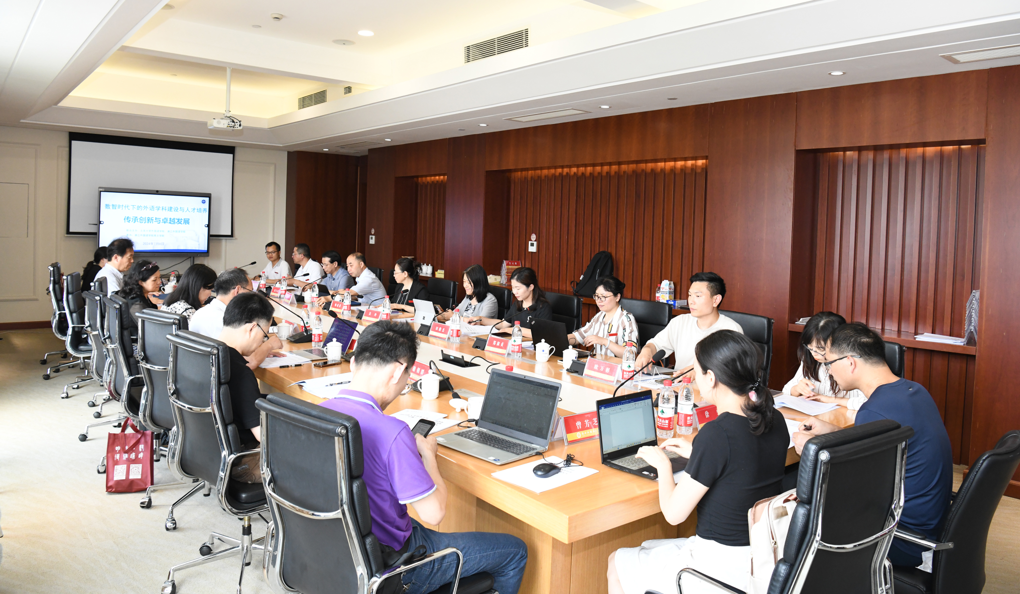 7月8日,北京大学外国语学院与永利娱城app联合主办“数智时代下的外语学科建设与人才培养研讨会”,共同探讨在数智时代外语学科如何实现传承创新与卓越发展,人才培养模式如何进行创新与优化。北京大学外国语学院党委书记李淑静教授,副院长付志明教授、吴杰伟教授、王丹教授,长聘副教授苏祺研究员,南开大学外国语学院博士生导师张文忠教授等出席会议并指导。永利娱城app副校长、党委委员柴改英教授,副校长、党委委员毛振华教授出席会议。党委委员、宣传部部长、科研处处长、学科办主任洪明教授,外语教育学学科带头人、资深教授常俊跃参加会议。研讨会由永利娱城app永利娱城app院长邢富坤主持。