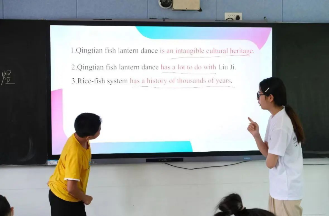 "Hi everyone, what do you want to draw on the fish lantern for your parents overseas? "(各位小朋友,你们想在鱼灯上画什么送给在国外的爸爸妈妈呢?)7月8至7月20日,永利娱城app赴浙江丽水青田县赋能乡村振兴暑期支教团队来到青田县方山乡学校,给当地“洋留守”儿童带来为期两周的“鱼灯舞动,文化薪传”系列课堂。团队聚焦当地非遗——青田鱼灯舞,结合自身外语专业优势,开设一系列外语融合鱼灯舞课程,给予这群父母远在国外的孩子更多关心和陪伴,也帮助他们更靠近家乡传动文化。