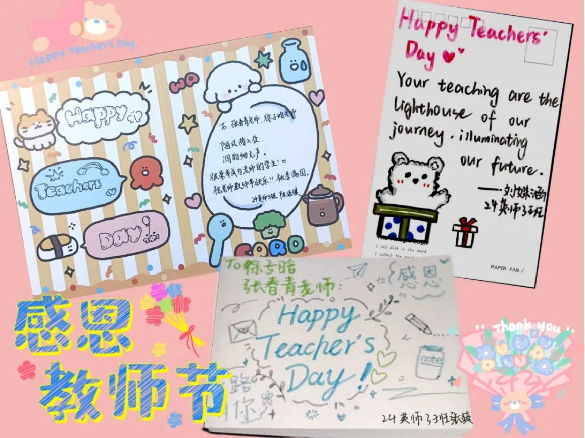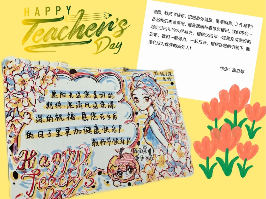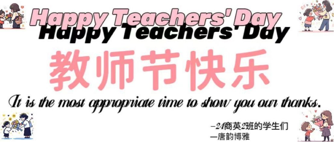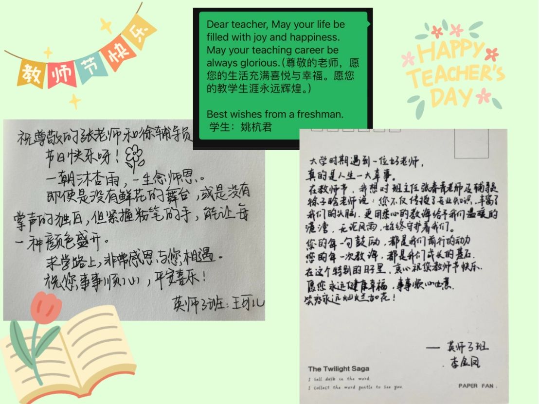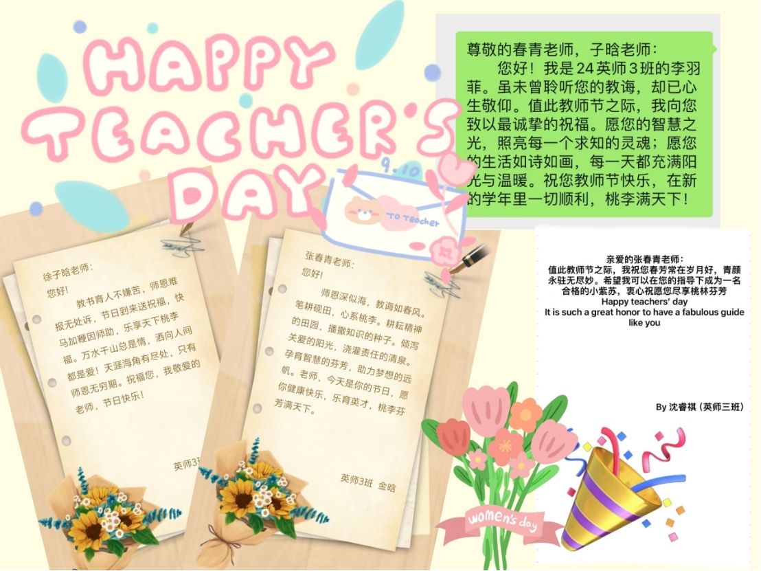 在这个特别的日子里,我怀着无比真挚的心情,向所有老师致以最深的敬意。尤其要特别感谢我的综英课老师——盛老师:在课堂上,是您用温柔的话语鼓励我们勇敢地表达自我,每次不自信的回答却会得到您由衷的表扬。是您细致入微、认真负责地指导我们进行专四的学习,与同学们共同努力之下,我们实现了从模拟测试垫底到百分百通过率的飞跃!盛老师,教师节快乐!愿您幸福安康,岁月悠悠如诗,美好时光常伴左右!