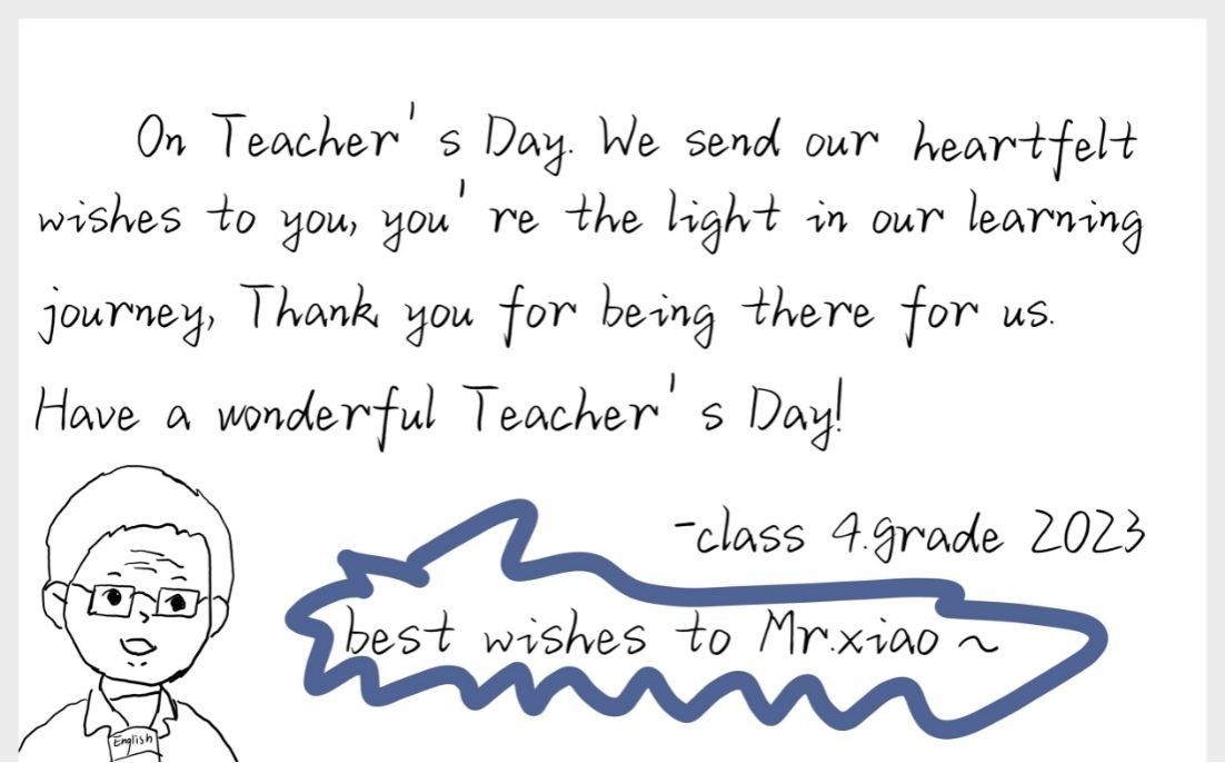 徐舒仪老师,祝您教师节快乐!无论是美国文学还是英国文学,您的课堂都是那么轻松愉快。我本不喜爱阅读文学作品但在您的课堂里我学到了许多知识。每一次报告虽然耗时很久,却都给了我主动探寻一部作品的机会,去感受文字间传递的感情,去培养自己的理解,还有这也大大锻炼了我的互联网检索能力。您也总是不吝夸奖,偶尔也会提出一些小建议,这给了内耗的我很大的鼓励。有时候,感觉您就像我们的朋友,你会略有所闻我们所熟知的话题,并给予回应。您是一位可爱温柔和蔼的老师,很荣幸在大学里遇到您。最后,祝您工作顺利,身体健康,天天开心!