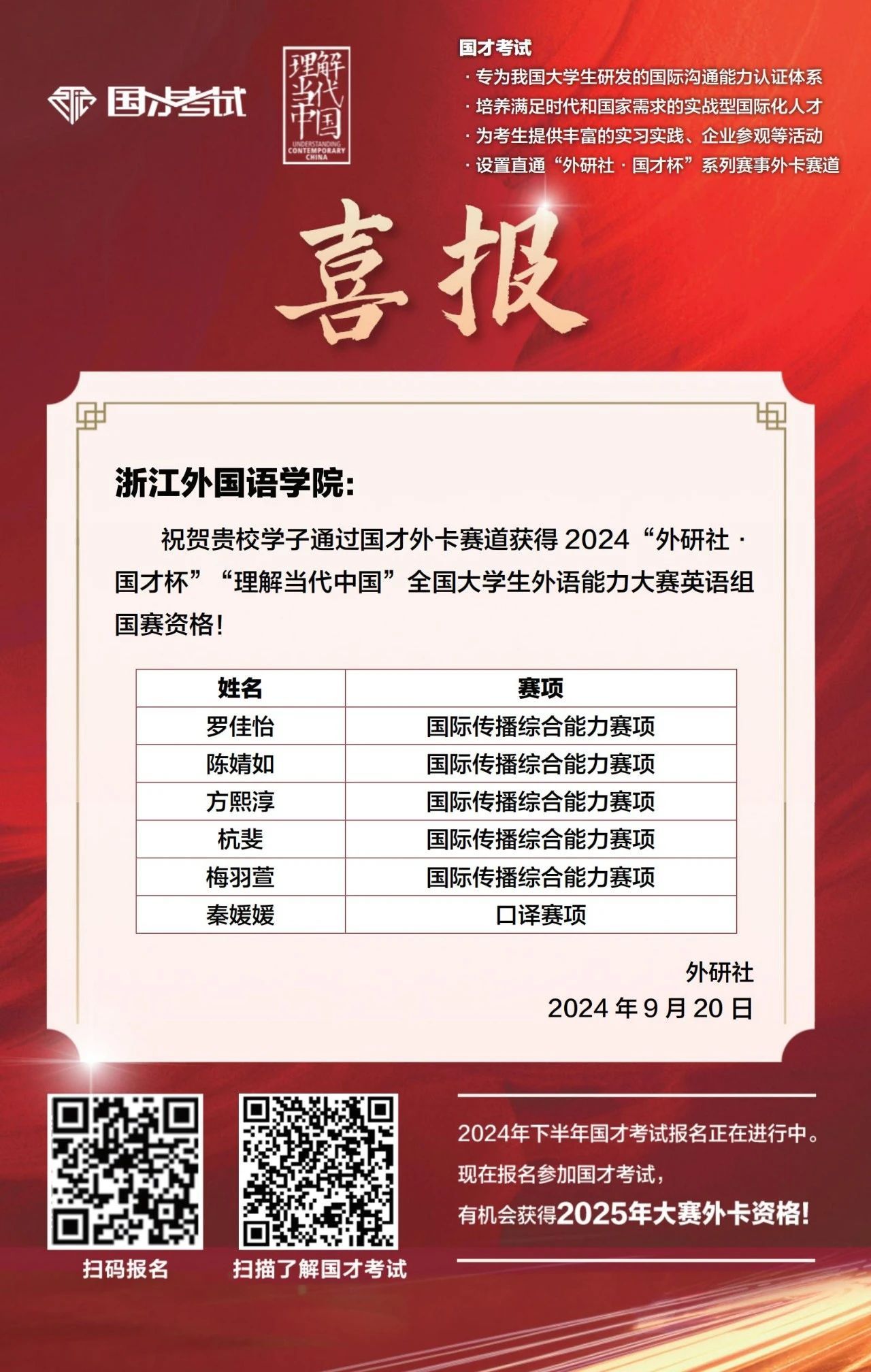 近日,2024“外研社·国才杯”“理解当代中国”全国大学生外语能力大赛国际传播综合能力赛项国赛外卡通道晋级名单公布,永利娱城app新增5个直通国赛名额。截至目前,永利娱城app已经有6位同学提前锁定国家级奖项!