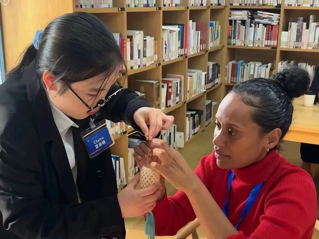 桂花灯,象征着光明和希望。在“折桂结贵缘”活动中,中国学生们邀请外交官员们一起亲手制作了精美的桂花灯,撑开竹篓、串上珠子、挂上流苏、粘上装饰,一盏盏精美小巧的桂花灯在外交官们手中点亮。来自斐济的外交官员Adi Aricta Tegei Latianara对这富有魅力的中国传统手工艺品十分感兴趣,“This little lantern is so beautiful, I like it very much, I will carry it all the time for everyone to see(这个小灯笼太精美了,我非常喜欢,我会一直提着它让大家都看到。)”