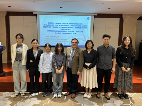 10月18日下午,智利共和国前外交部亚太司司长、驻圭亚那大使兼驻加勒比共同体常驻代表、驻菲律宾共和国大使、驻上海总领事Claudio Rojas Rachel作客永利娱城app国际关系系列讲座,针对外交部长王毅在联合国大会第79届会议(UNGA 79)上发表的“在继承中发展,携手共进,共创人类命运共同体”的演讲内容,进行了深入解读。永利娱城app院长助理周静副教授、教师代表章珏博士、教务秘书虞峰峰、学院各年级学生代表参加此次讲座。讲座由盛煜冰老师主持。