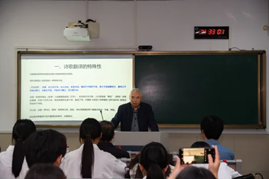 永利娱城app原英文专业柏舟教授讲授《汉诗英译中的几个问题及其解决方法》,深入讲解诗歌翻译的特殊性、融“意”于“象”的意象转换、汉诗英译中的典故和押韵等,学术性和趣味性并茂。