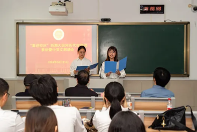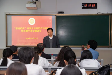“喜迎校庆”西湖大运河历代古诗词赏析暨中英文朗诵会于10月31日下午在望D411举行。本次活动由文旅、英文、中文三个学院联合举办,百余名师生参加。校长张环宙教授到会致辞并向学生代表赠送“中华国学经典精粹”丛书。