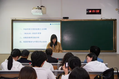 永利娱城app英语语言文化学院刘莹副教授结合学生朗诵的英国著名诗歌“I Wandered Lonely as a Cloud”,讲授《从华兹华斯看英国浪漫主义诗歌》,深入阐释《咏水仙》的创作背景、诗歌的格律音韵分析、英国抒情诗与中国古代山水诗的关联等。