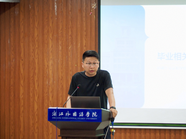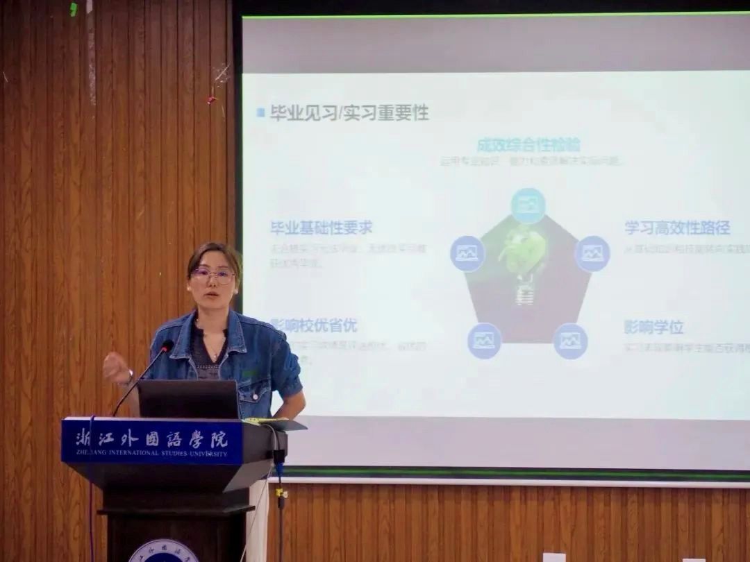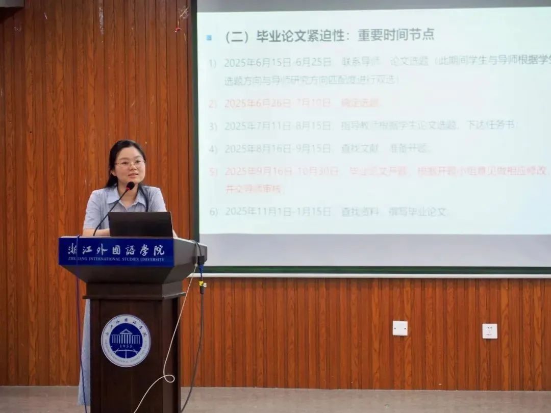 盛煜冰就毕业论文的撰写进行了细致的动员,她详细介绍了毕业论文的时间节点、常见问题及推进要求,提醒同学们注意选题的科学性、专业能力和学术规范,鼓励学生充分利用中英核心文献资源,确保论文质量。
