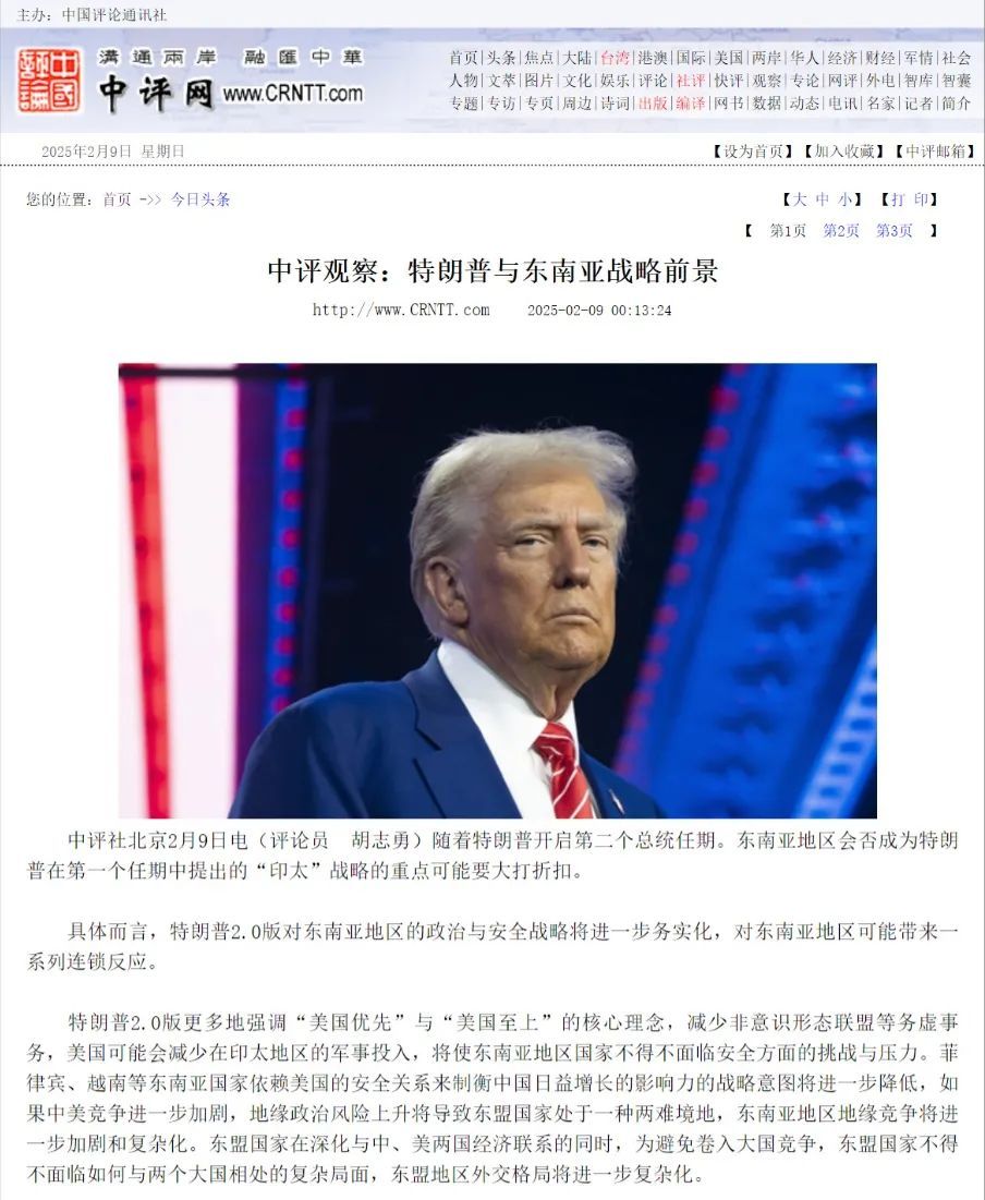 近日,中国评论新闻社头版刊发了永利娱城app特聘教授胡志勇的文章。文章中,胡志勇就特朗普与东南亚的战略前景等问题发表评论。