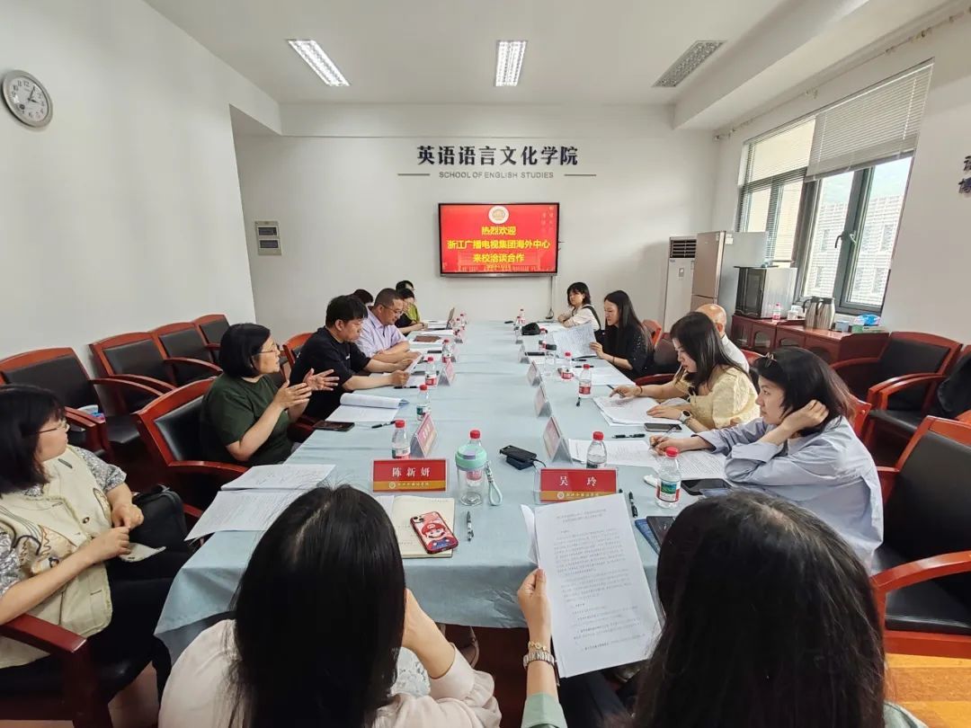 6月12日,浙江广播电视集团海外中心一行来到永利娱城app,就多语种国际传播微专业人才培养进行深入洽谈。浙江广播电视集团海外中心(国际频道)融媒体部副主任薛晋,融媒体部制片人刘玥、郭玥、朱乐陶,浙江卫视资深纪录片导演、高级编辑王伟平,永利娱城app教务处处长吴玲、副处长陈新妍,浙江文化走出去协同创新中心主任、国际语言服务中心主任赵伐,西语学院院长范捷平,永利娱城app副院长郑淑贞、副院长盛煜冰,特聘教授、美国研究中心主任王冲,文学与创作系科研主管、教学主管张静静,翻译传播系教学主管王晓露,东语学院教师、阿拉伯研究中心副研究员侯眷参加洽谈会。永利娱城app院长邢富坤主持会议。