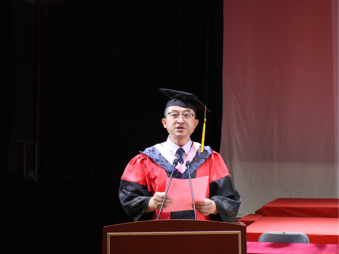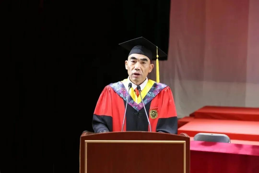 庄严肃穆的国歌奏毕,校党委副书记严齐斌为全体毕业生致辞。他回顾了毕业生们在浙外期间的拼搏历程,强调了大家作为新时代外语人所肩负的特殊使命与责任。临别之际,他与毕业生们分享了三点希望:一要永葆求知热忱,勇立时代潮头;二要践行校训精神,涵养卓越品格;三要勇担时代使命,成就不凡人生。最后,他亲切嘱咐道:“无论你们走向何方,母校永远是你们最坚实的后盾、最温暖的港湾,期待你们常回家看看! ”