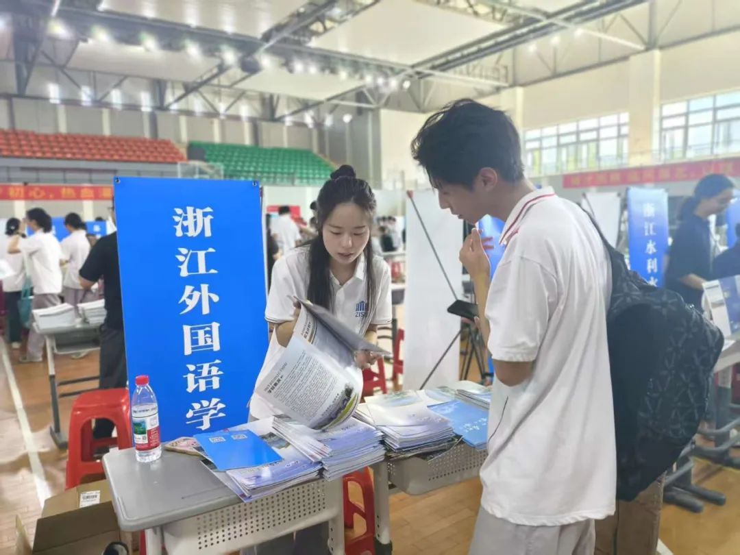 在杭州市源清中学和杭州淳安中学,徐舒仪老师的父亲作为“编外宣传员”成为亮点,他手持学校2025招生指南如数家珍般向考生及家长介绍我校的优势特色、历年录取位次号等,他以一名专任教师家长的身份,讲述了学校的发展历史和发展定位,话语间充满了自豪和肯定。