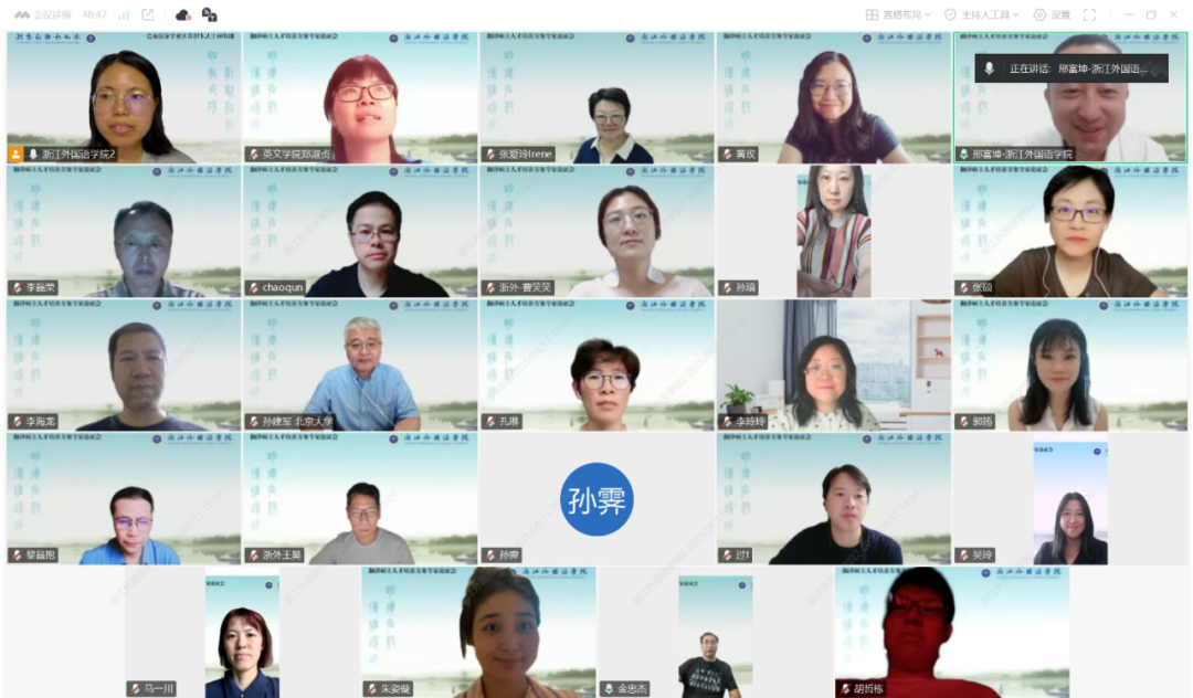 在专家论证环节,张爱玲指出,翻译硕士专业学位教育应更加注重实践成果的呈现,避免学术化倾向,在培养目标、课程设置、学位成果等方面都要突出实践导向,并且要高度重视实践基地建设和行业专家队伍建设的重要性,要求实习机制化、协议化,确保学生有足够的实践机会和反馈机制。