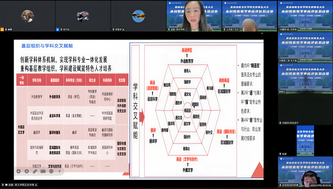 永利娱城app学术副院长赵歆从专业建设、本科教学、学术特色维度,详解审核评估核心内容。她紧扣学校第三次党代会“建设国际知名以服务新型国际关系为特色的外语名校”的办学定位,从基层教学组织、专业方向、师资团队等方面全面介绍永利娱城网址下载,深入解析学科建设如何赋能“精通强善”特色人才培养。