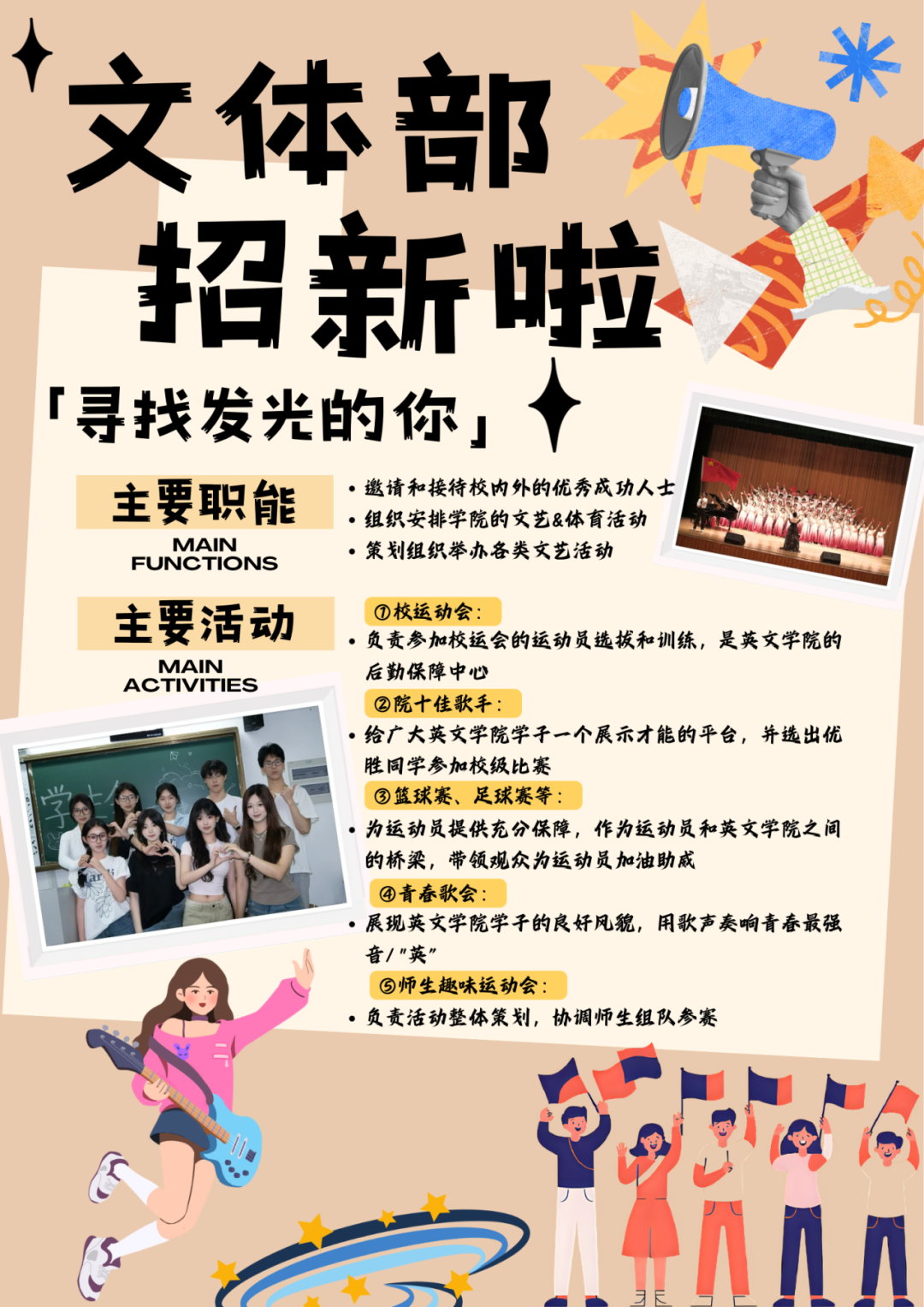 想要感受有趣灵魂的碰撞吗?想要参与数不完的团建吗?想要在快乐中提升自己吗?在永利娱城app学生会文体部,这些通通可以实现。我们主要负责邀请和接待校内外的优秀成功人士,组织安排学院体育活动以及策划组织举办各类文艺活动。在文体部,你可以负责参加校运会的运动员的选拔和训练,负责运动员们的后勤保障。你可以组织策划院十佳歌手,给广大英文学子搭建展示才能的平台,并选出优胜同学参加校级比赛。同时,作为运动员和学院之间的桥梁的篮球赛,足球赛和展现英院学子的良好风貌,用歌曲奏响青春最强“英”的青春歌会比赛正等着你们的参与。