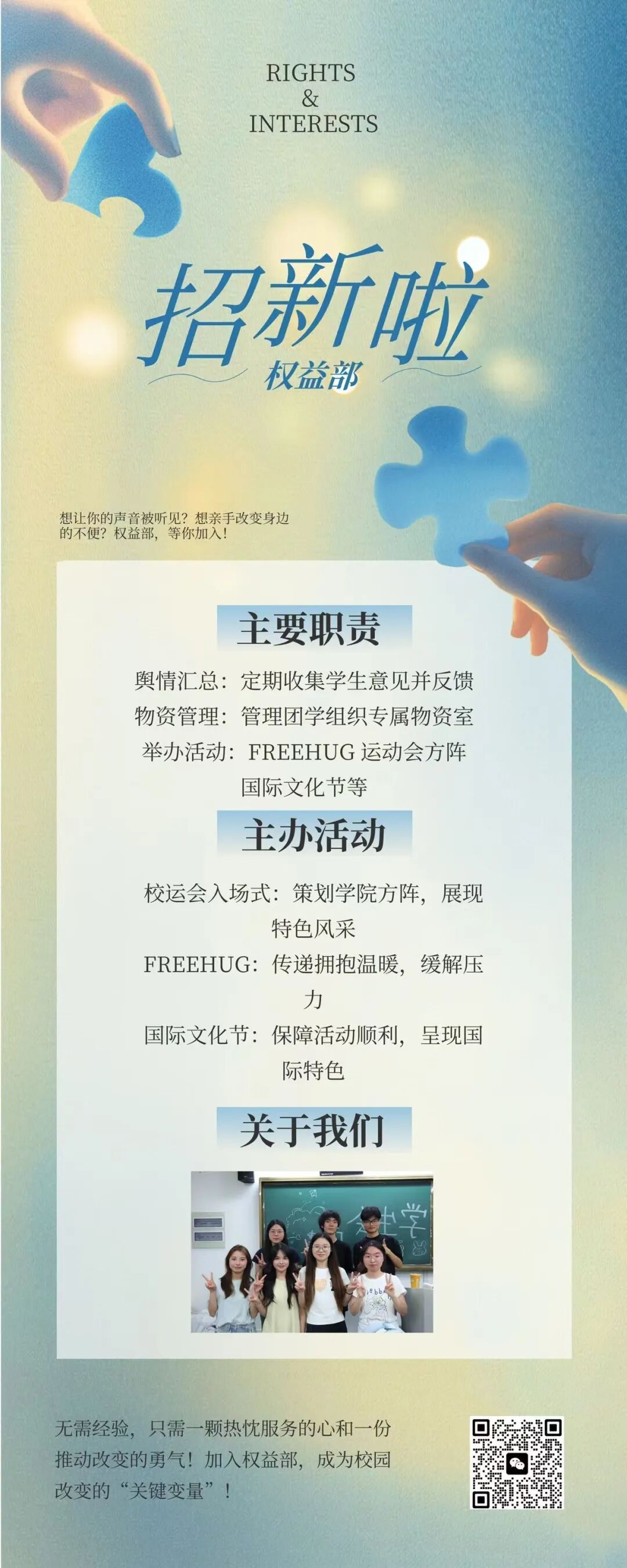 齿轮再度转动,一枚印着“权心权益”字样的扭蛋稳稳落下——拆开蛋壳,权益部的温暖内核便清晰浮现,责任与温情,正是这颗扭蛋最鲜明的标签。权益部作为物资室的管理者,它妥帖收纳着团学组织的所有物资,每当其他部门筹办活动,总能从这里取出及时的物资支持与周全的后勤保障,是幕后可靠的“补给站”。此外,它带着倾听的耐心,密切收集同学们的意见与反馈,将每一份心声认真整理、及时汇报给学校领导与相关部门,为大家争取应有的权益与福利;也从学生需求出发,策划各类服务活动,用守望相助的力量,把关怀送到每一位师生身边。