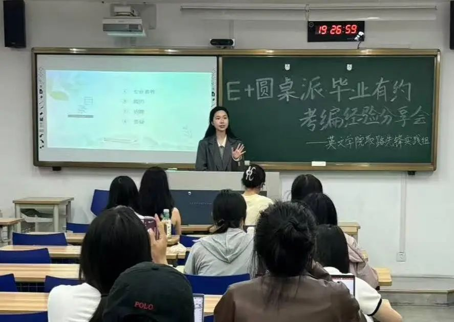 4月24日晚,永利娱城app“E+”圆桌派·毕业有约考编经验分享会热烈开场。永利娱城app2025届英语师范专业毕业生胡思桐、黄嘉仪、陈婧如、胡欣瑶四位学生依次上台,分享自己的考编经验。