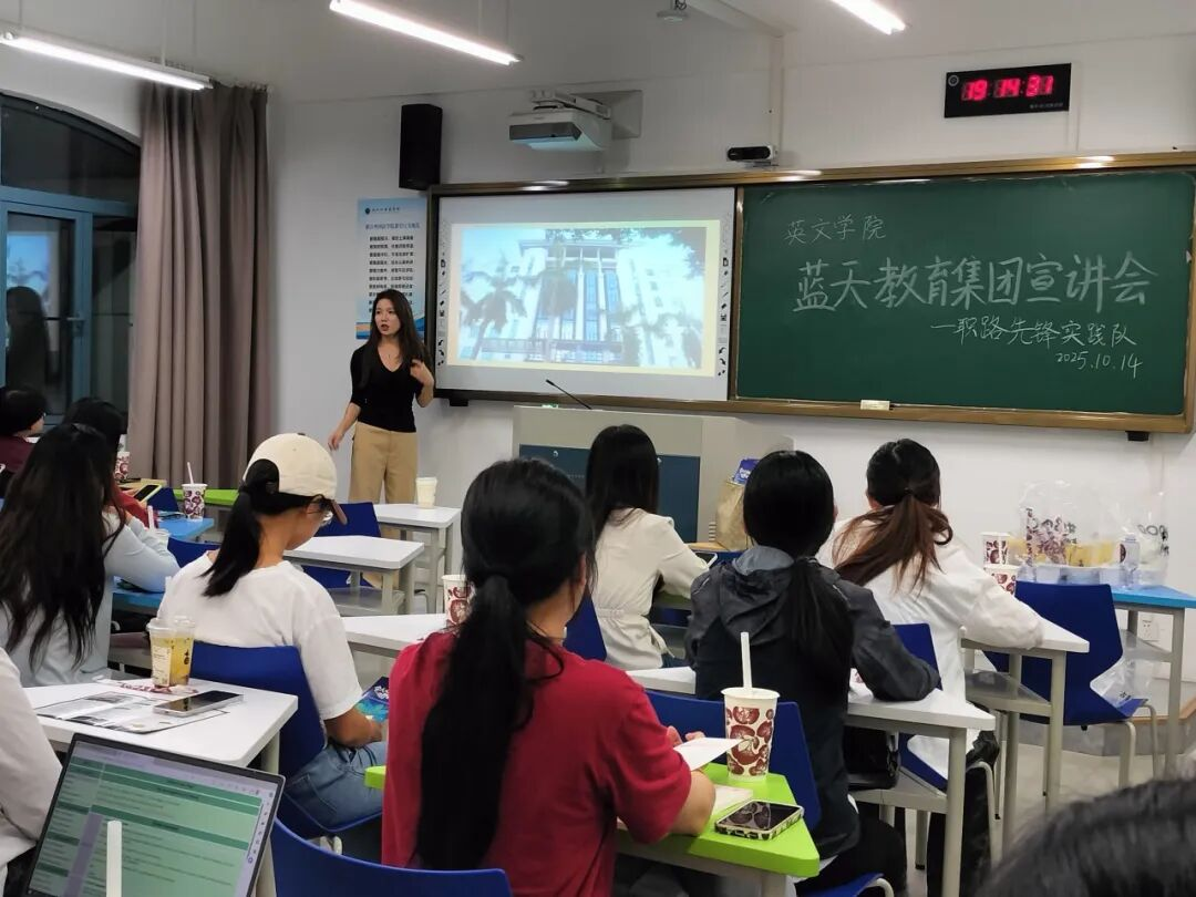 近日,深圳蓝天教育集团2026届校园宣讲会在融院B108顺利举行,深圳市蓝天教育培训学校江浙区英语校招负责人张信紫、张烁及学院20余位学生参与本次活动。